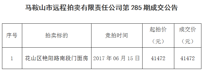 馬鞍山市遠程拍賣有限責任公司285期拍賣成交公告