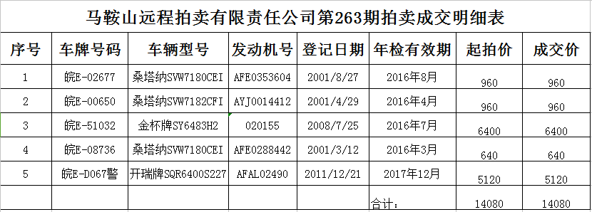 馬鞍山遠(yuǎn)程拍賣有限責(zé)任公司第263期成交公告