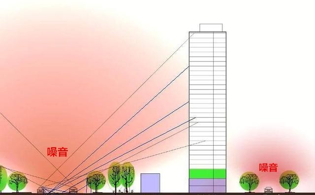 很多人認(rèn)為樓層越高,噪音越小,其實(shí)不然。噪音大小,要看噪音源的位置以及周圍是否有遮擋物。以下圖為例,臨近主干道的樓棟,噪音源是交通噪音,由于有綠化帶的存在,中間樓層接受到的噪音要明顯高于低樓層和高樓層的。